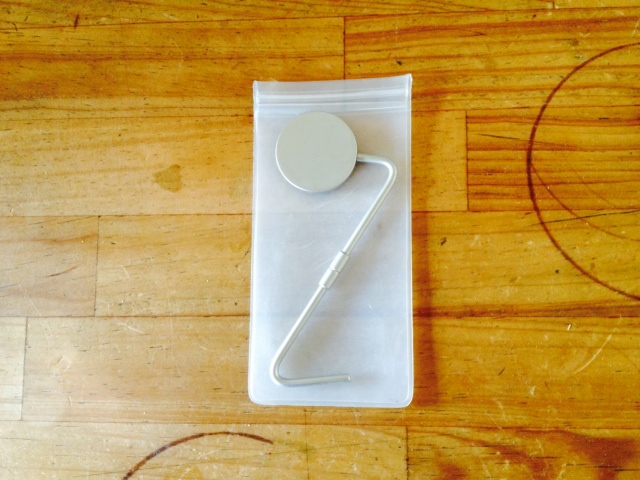 追記:机の金具にマグネットをつければコレが必要ないのに気付いてしまった。 バッグをかけてあってもちょっとぶつかってよく落とすので、 使うのをやめることにした。(151122) バッグをテーブルなどにちょこっとかけておくのに便利。 なのだがちょっと浅い。 今は、書類を整理するときにレジ袋をかけてゴミ袋にしたり、 自宅でちょっとバッグをかけておくのに使っている。 (バッグはうちに帰ると中身を全部出すことがおおいのだけれど) ちょっと無理に使っている感じが無くもないので 本当に必要かどうかは確かめ...