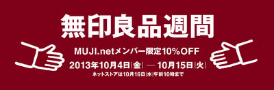 【無印良品週間|無印良品】期間:2013年10月16日午前10時まで 無印良品よりセールのお知らせ。無印良品週間は、無印良品のものづくりの取り組みを、もっともっと知ってもらうための特別期間です。日頃の感謝を込めて、無印良品メンバーの皆さまに10%OFF価格でご提供します。この機会に、ぜひご利用ください。さぁやってきました、10%OFFの無印良品週間です。丁度、模様替えの時期にあたり、新商品も続々入荷中です。寒さに備える準備をお得なこの機会に是非!! ★★★いろんなブログ探しに行こう★★★ JUGEMテーマ:無印良品