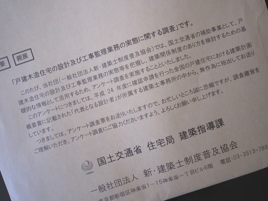 JUGEMテーマ:建築士 一戸建ての木造住宅に関する設計監理業務の実態を把握するという名目で、国交省からアンケート用紙が届いた。窓口になっているのは、(社)新・建築士制度普及協会。アンケートは無作為に選んだ建築士事務所に送られたもので、木造の一戸建て住宅の設計業務に関する内容で、建築者は誰かと言ったことや、作図した図面の内容や時期、工事監理に際して、現場にどの程度行ったか、という具合に多岐に渡っている。そこそこ面倒臭い・・・・・・。でも国交省からのアンケートだし、無視する事など出来ない小市民な私...