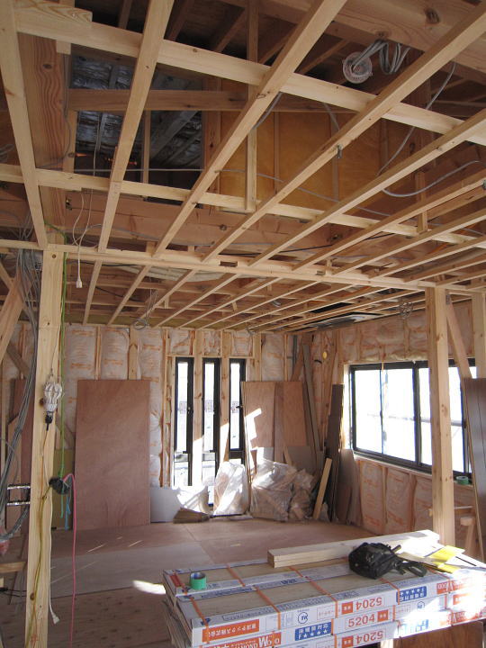 JUGEMテーマ:建築士栄町の家は、大工工事中。でも今日は、大工さんが不在。静かな工事現場って、なんか不思議な雰囲気がある。もう少しすると、ここで施主ご家族の新しい生活が始まる。笑ったり、泣いたり、喜んだり、悔しがったりしながら、歳を重ねていく。思い出を重ねていく、賑やかな場所になることを想像する。静かな工事現場の中で。2階リビングの家なので、その上に設けたロフトが見える。屋根にも登ってみる。高い所が苦手なので本当は嫌なのだが、工事中の屋根だけは別。足を震わせながらでも、やっぱり見るべきだし、見る...