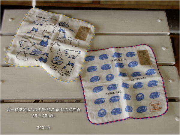 今日は新登場の タオル&ハンカチのご案内です では 早速 ちいさなサイズから 順にご覧くださいませ かわいいイラストと 縁のパイピングが特徴のガーゼハンカチ いろんなネコが描かれてますね このイラストの面がガーゼ素材で 裏は無撚糸パイルという素材 通気性と吸水性がよく ふんわり柔らかなガーゼハンカチです はりねずみも カワイイ ♪ 続きましては 海外の絵本から飛び出して来たような 色合いが素敵な この3つのハンカチ とっても綺麗な色使い ♪...