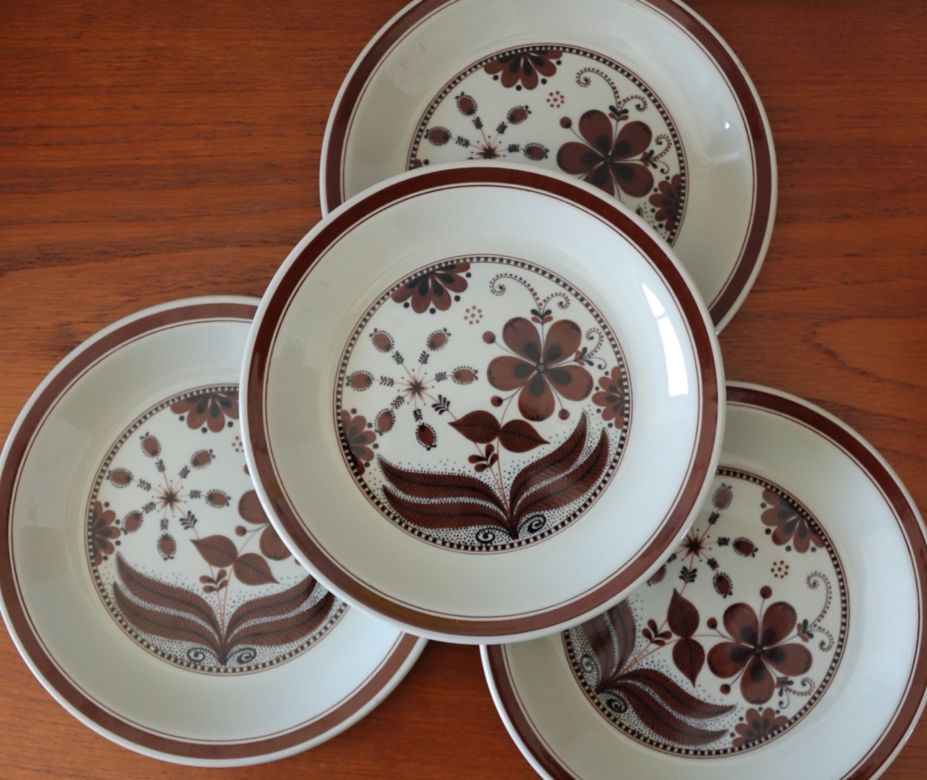 JUGEMテーマ:北欧インテリア 先日到着した、 ノルウェー最北端からのヴィンテージ便。 スイーツがお好きな方には、 このプレートも良いかもしれません。 スウェーデン、GefleのYlvaシリーズ。 4輪の花模様が愛らしい、 レトロで穏やかなシリーズです。 カップとデザートプレートには 手を繋ぐように整然と並ぶ花模様。 緑とブラウン、に差し色で黄色。 それだけでひとつの世界観がある器です。 カップ、ソーサー、デザート...