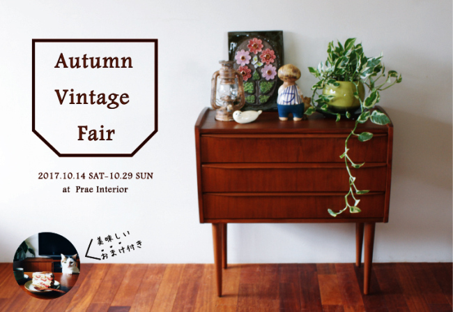 JUGEMテーマ:北欧インテリア 明日から、 ヴィンテージ家具や雑貨がお勧めの Autumn Vintage Fairの開催です。 期間中にヴィンテージ家具や雑貨を 店舗やWEBでお求めいただくと、 お買い上げ金額が10,000円ごとに 美味しいスイーツ店、エクレールさんの ギフト券を500円分プレゼント! (プラエのギフト券に代替も可です。) イベントにあわせて、 ヴィンテージ雑貨も入荷してきました。 期間中にも入荷は続きますので、 美味し...