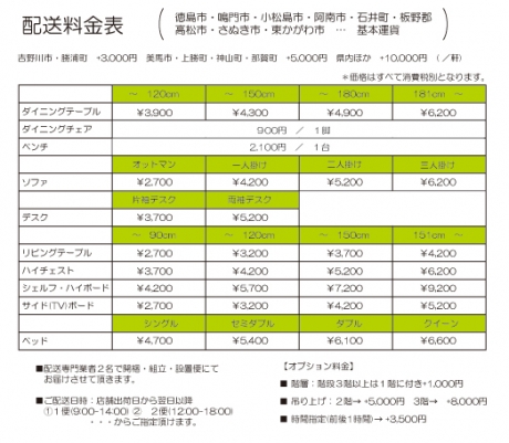 JUGEMテーマ:北欧インテリア 平素よりプラエインテリアを ご利用いただき、誠に有難うございます。 2017年8月1日より家具のご配送方法を 下記のとおり見直しさせて頂きます。 具体的には時間のご猶予をいただきますが 現状の徳島市に加えて 下記地域が基本料金のみでご配送を させて頂くことが可能となりました。 [徳島県] ■鳴門市 ■小松島市 ■阿南市 ■石井町 ■板野郡 [香川県] ■高松市 ■さぬき市 ■東かがわ市 またお見積もり方法...