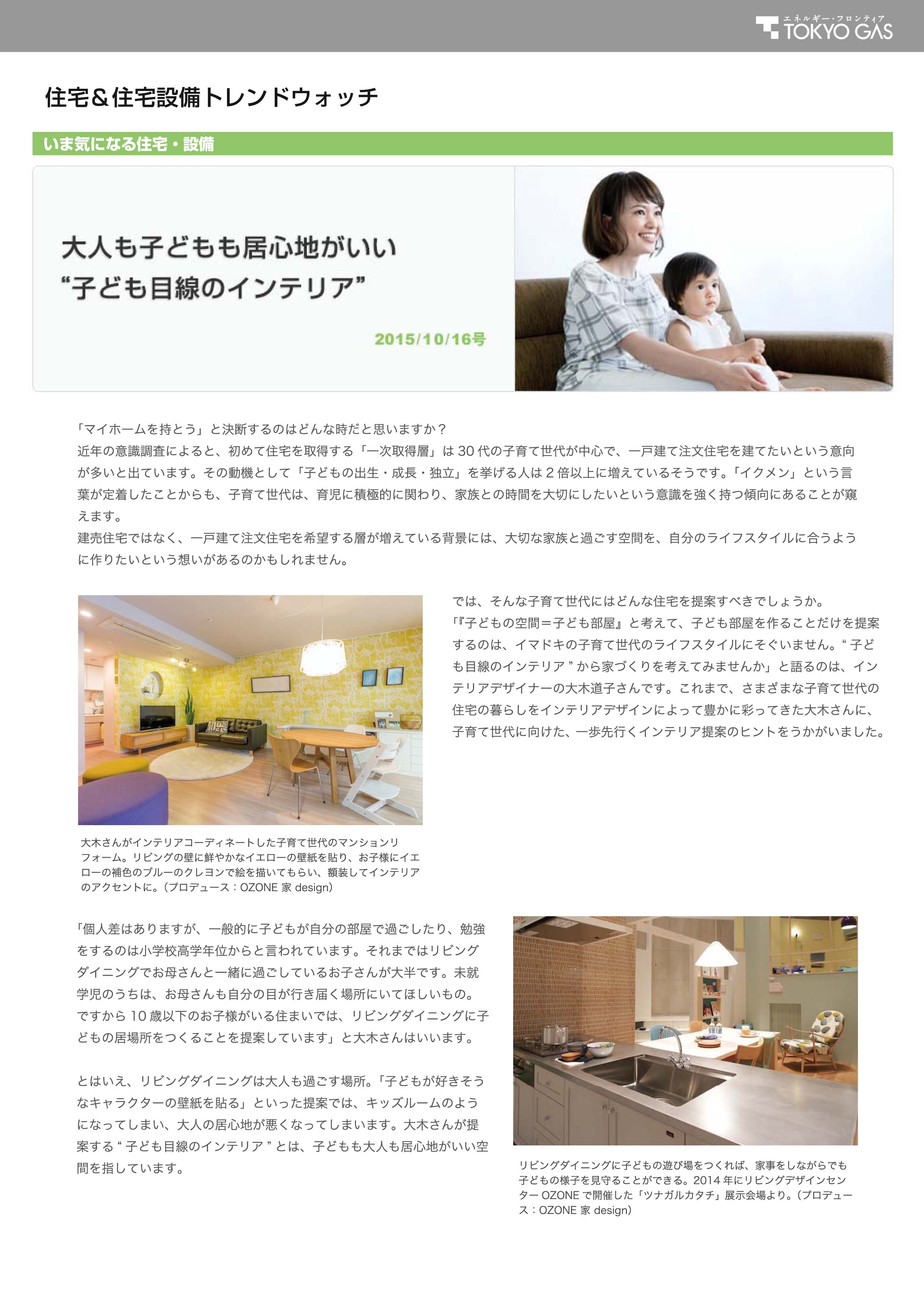 こんにちは インテリアデザイナーの大木です 東京ガスホームページ内に、住宅のトレンドを紹介するサイトが新しくでき インテリアのプロとして、「子どもがいるリビングダイニング」の紹介をしました