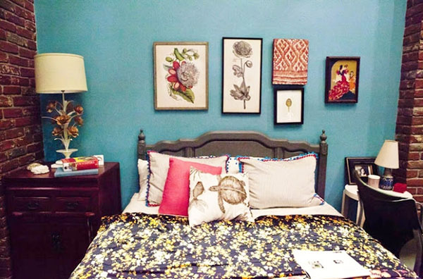 JUGEMテーマ:インテリアコーディネート 海外ドラマ"new girl"から、多めにセットを紹介します。 淡いターコイズのクロスが素敵な寝室。 ポイントは煉瓦とピンク。煉瓦に合わせたダークブラウンの家具でシックに決めてますが、フラワーモチーフのランプでクラシックなフェミニンさを出しています。 小花柄をカバーに持ってきた事で、ポンポンクッションのカラフルさがコーディネートされてますね。小さめの柄ばかりのとこに、一個無地のピンクを入れてアクセントにしています。一番手前の亀さんクッションは遊べるポイ...