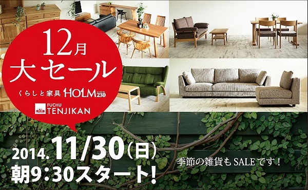 JUGEMテーマ:インテリアコーディネート くらしと家具 HOLM230 インテリアショップ FUCHU TENJIKANにて 12月大セールを行います!! 厳選されたインテリアたちが特別プライスへ お気に入りの家具たちがお買い得にそろうチャンス ぜひ足を運んでみてください。 素敵な家具たちにかこまれたシンプルライフ 12月はHOLM230で楽しい時間を過ごしてみましょう!! にほんブログ村 ...