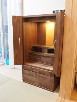 本日お届けしましたユーザーNさまの別注家具です。 LEDライト付で折り戸仕様です。 *ボーテデザイン・Wナット材* 置く場所に合わせてサイズ・仕様とオーダーして頂き お造りした仏壇。 家族が集まる場所に置きたいけれど 中々お部屋に溶け込むデザインやサイズ感が合わない というお声を聞くことの多い仏壇ですが Nさまも他のお店で探していた時に デザインやサイズ感が気になり あまりピンとこなかったそう。 お使い頂いているバックキャビネットを とても気に入って頂き ...