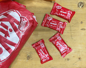 そういえば先日のイベントの搬入日のこと。 がが〜っと動いたらしばし休憩、が私たちのパターンで、 ぬかりなくちょっとつまめるオヤツも持っています。 それが写真のキットカットなんですが、 開けると一つ一つに、47都道府県の言葉で 「休憩しよう!」的なメッセージが書いてありました。 岡山県のは、 『ちぃと break しょーやー』 他にもいろいろあって、 『おめさんも break なしら?』(新潟県) 『たまには break いがっぺ?』(茨城県) ...