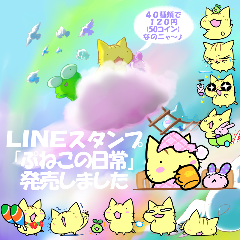 JUGEMテーマ:絵日記★ 宣伝させてください♪ ぱじかわ仮面個人としては初のLINEスタンプ! 「ぷねこの日常」 が無事に承認され、発売することができました〜!! https://store.line.me/stickershop/product/3004926 絵柄は一般的な40種類で120円となっております。 LINEコインでは50コインという表記になります。 1つ1つ愛情込めて描きました ぷねこ好きの方も初見の方も、 販売ページに行って眺めてもらえるだけでも嬉...