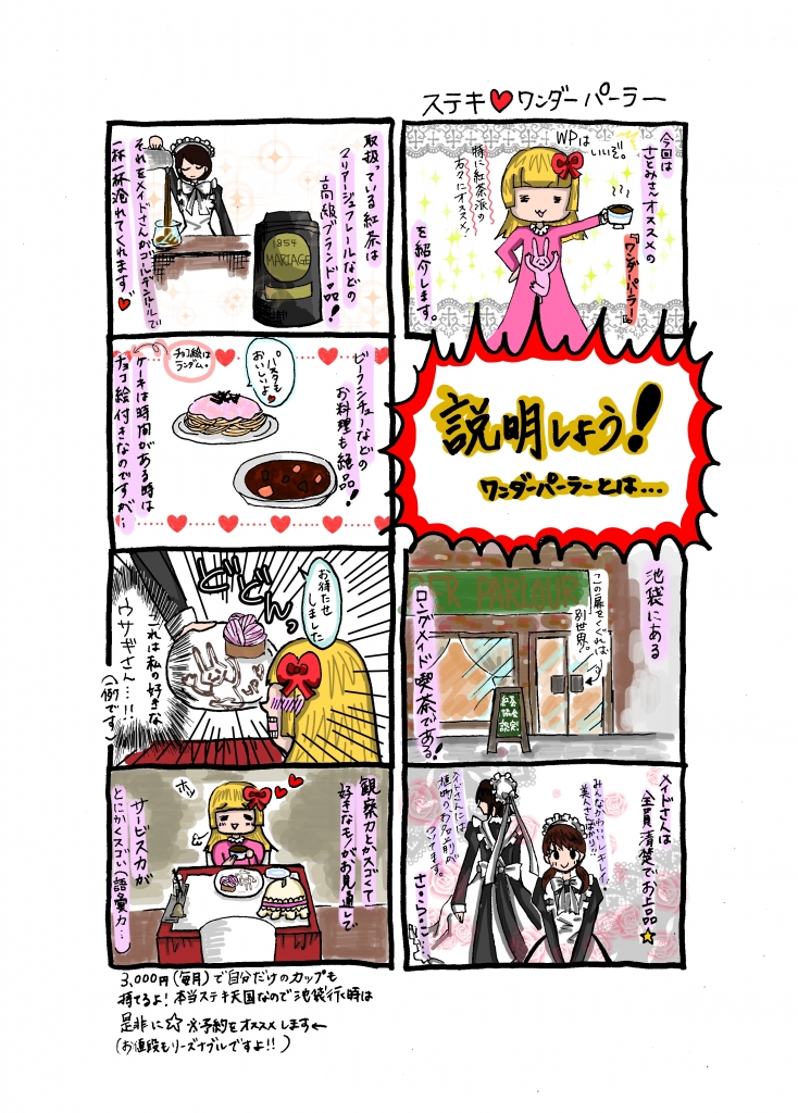 池袋にある「ワンダーパーラー」という ロングメイド喫茶が、 とってもいいゾという布教漫画です 8コマじゃ収まりきらないくらい、 本当おすすめポイントが多すぎる。 あ、チョコ絵はお店の混雑状況にも寄るので、 ご了承ください。 (と私が言っていいものなのか←) 励みにしたいので、 ポチっとお願いします!↓↓ 人気ブログランキング にほんブログ村