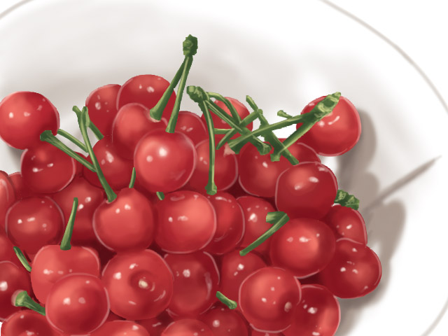 JUGEMテーマ:絵日記★ 庭のサクランボがいい感じに熟れました。 今年は父が網をかけたので、鳥に食べられずに済んでます。 その木の真上に、カラスの巣があるそうな……。 使ってなくて草だらけの無法地帯を、畑にしようということで、父と頑張って耕しました。 草の根が地面にびっしり張ってて、大変でした。 明日は肥料を入れて、畝を整えます。 完成したらキュウリを植える予定です。 ところで、ヘタを描くのがすごく苦手です。 どうしてもサッと描けませんし、馴染みません。 頑張ってヘタのあるも...