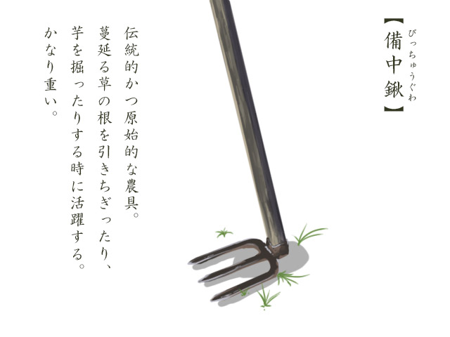 JUGEMテーマ:絵日記★ 耕して、肥料を撒いて、また耕して、畝をこしらえて……。 気力・体力ともにゲージが真っ赤なので、今日は軽めにさらっと。 この備中鍬、私は今ひとつ名前が覚えられなくて、つい「三本のアレ」とか「フォークっぽいの」と言ってしまいます。 うちにあるものは、かなり年季が入っていて、多分私が生まれる前からあると思います。 まだまだ現役です。