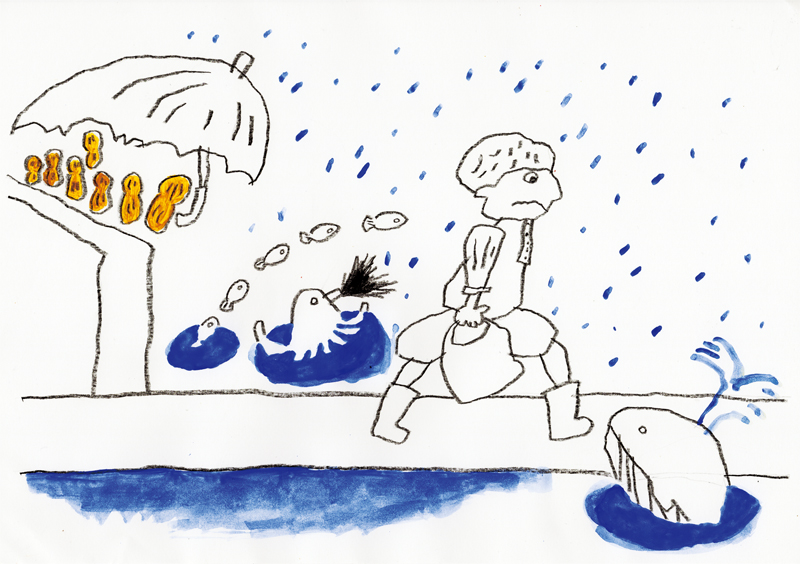 JUGEMテーマ:絵日記★ らっかせいを かいに スーパーへ いった。 きりさめが ふっていて、みちには みずたまりが できている。 ちいさな うみみたい。 「うみ、うみ、うみ」 そう つぶやいていたら、うみの ものが たべたくなった。 いつもは かわない くじらの おさしみを かってかえった。 「ん? なにか わすれている!」 たべられずに すんだ らっかせいたちは、 いまごろ わ...