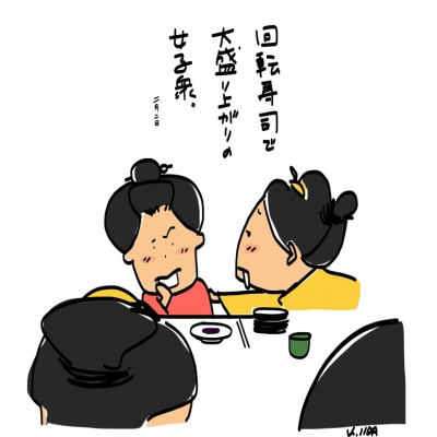 女子衆と書いて おなごし。 お箸がこけたのもおかしいお年頃。 そして僕は 回転寿司屋で服装キメキメの人を見かけると なんだかおかしいお年頃。 そんなのが我々庶民の平和な日曜日。