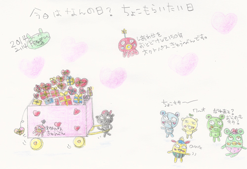 おぉ〜い!毎年2/14はオラにとっては”Fxxk ヴァレンタイン”な日だったけど、どうやらブログ始めて人気でちゃったみたいで(●´ω`●)ゞ、オクトパス急便のクロネコ野郎がリヤカーにいっぱいチョコ運んできた(ノ´▽`)ノ つうかみんなかなりビックリしたみたいで、オラの人気も遂にオバマの支持率越えかぇ?次の目標は安倍ちゃんダヌ(^O^)/ JUGEMテーマ:オリジナルキャラクター JUGEMテーマ:絵日記★