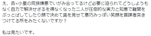 今回はフォロワーのはねちゃんの呟きを見て、面白そうだったので、描いてみることにしました。 おお、小星と杏! 似た者同士のこの二人、ナイスアイデアです。 スケッチ感覚でさくっといってみましょう。 ラフ→線画(適当)。 「おととい来やがれ!」 勢いだけで描きましたが、勢いこそ必要な絵だと思うので、これで良いかと!(笑) 杏を描いたのはこの時が初めて。 単体でも描いてみたくなったので、これもさくっと描いてみることにしました。 アタリ→ラフ。 線画→塗り。 陰影+描...