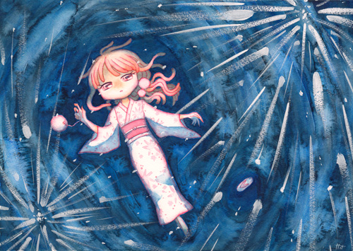 「とけよう」 B4サイズ、ホワイトワトソンボード、透明水彩、不透明水彩 華やかな火花と賑やかな音が降りかかって 暑い。 もう水と一緒に 溶けてしまえばいいんじゃない? ふたり展〜水彩の四季〜出品作品。 JUGEMテーマ:illustration