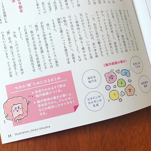 太陽って1時間に15度移動するんですよね…。 部屋から外に出ると、 明るく暖かだった太陽はすっかり隠れてワープしたように夜。 狐に摘まれた気持ちですが… 家に届いく見本誌に癒されています。 素敵な表紙の「RIN」にイラストを描かさせて頂きました。 ジャパンローヤルゼリー株式会社様の「いつまでも幸せな女性であるために」という テーマに基づいた会報誌「RIN」。 藤田先生 監修「心と体が“腸“喜ぶ...