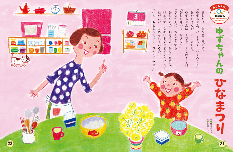 もうすぐ雛祭りですね。 対象5、6歳児の総合学習絵本キンダーブック「がくしゅうおおぞら」3月号で ?ゆずちゃんのひなまつり?というお話にイラストを描きました。 私の子供時代の家の雛人形は三頭身で内裏雛と三人官女、五人囃子くらいで、 ガラスケースに入ったコンパクトなものでした。 今思うと着物もシックで素敵だったかなぁ?とも思いますが、 子供の頃は、近所のお友達の家の九段の華やかなの雛人形が羨ましくて羨ましくて、 彼女の家ばかり遊びに行ってたことを...