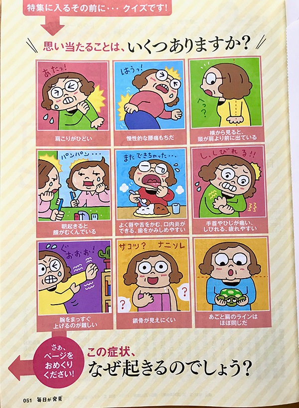 こちらも遅くなってしまいましたが、まだ間に合います! 「毎日が発見(株式会社毎日が発見)」6月号でイラストを描かせて貰っています。 50代からの女性誌で、暮らしの整え方に取り組む雑誌です。書店では販売しておらず、定期購読のみの雑誌です。 以前「脳活」のイラストを描かせて貰ったことがありますが、今回は二度目で「ドクター細野のゆがみ改善教室(51p〜)」の扉ページを担当させて貰いました。 色んな「ゆがみ」に悩む女性を描いています。 ...
