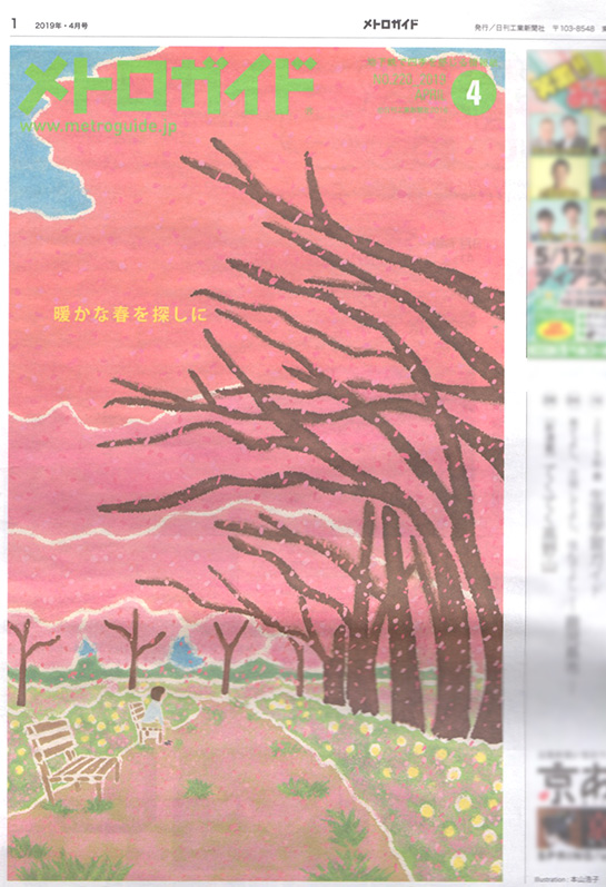 3月も中場になりました。 河津桜が満開の時期でそろそろ春の足音がやってきますね。 日刊工業新聞社発刊 情報誌「メトロガイド」NO.220 2019年4月号 の表紙イラストを描かせていただきました。 桜満開のイラストです。 桜の散りゆく様は美しいですよね、時間に構わずのんびり、ゆっくり 独り占めして眺めてみたいものです(笑顔) 今回、キャッチフレーズ「暖かな春を探しに」も私が考えさせて いただきました。 ソメイヨシノが満開になるのは、3月末〜4月中 各所でイベントも行われる...