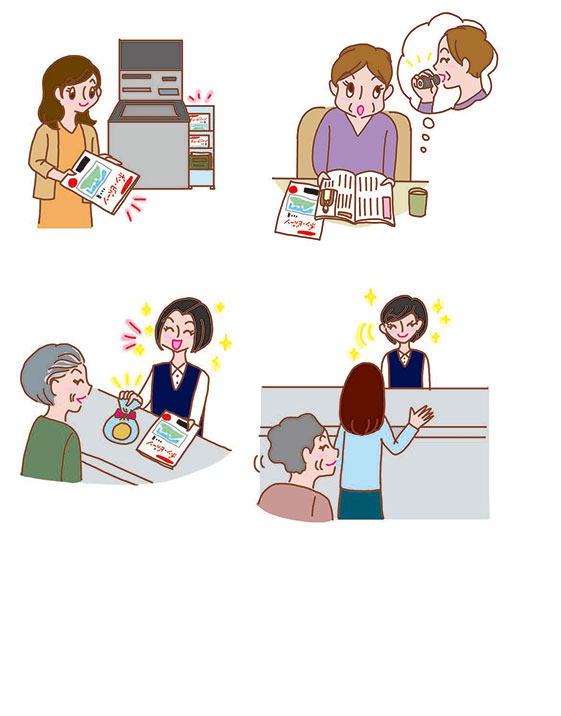 夏も後半になりましたが、まだまだ暑いですね。 全国信用組合中央協会 情報誌「ボン・ビバーン」vol.118 2018年10.11月号 の「読者のお便りから」のコラム連載のイラスト(p12,13)です。 今号も4点を描かせて頂きました。 しんくみのロビーに置いてある血圧計を試している男性 のイラスト ボンビバーンの冊子とお菓子をもらっている高齢者の女性 ATMの隣においてある冊子を手に取る女性 ボンビバーンの特集を読んでい...