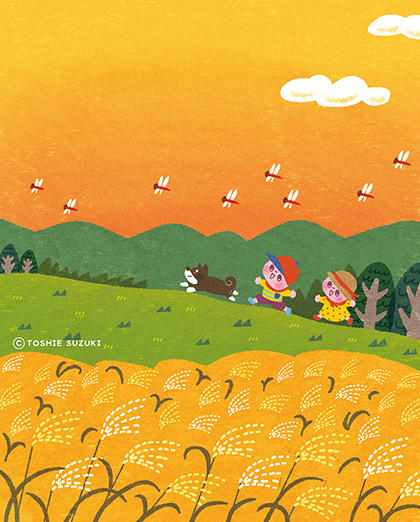 JUGEMテーマ:お仕事のイラストレーション&デザイン Copyright © Toshie Suzuki All Right Reserved. 学研教室「Smile」10月号の表紙を担当させて頂きました! ありがとうございました。 秋といえば夕焼けが綺麗な季節ですね☆ 夏の終わり頃は綺麗な夕日をたくさん見れました。 今の時期は、日が暮れるのも早く、 気づいた頃には日が暮れてしまってたりして、 夕日を見逃すと少し残念な気になります。 夕日に赤とんぼにススキと日本の良き...