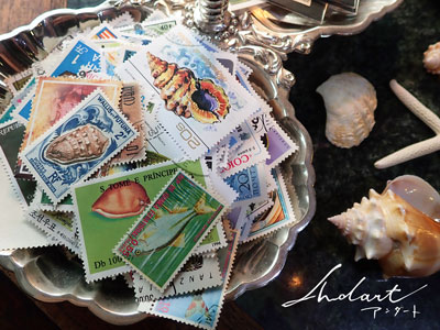 Andartギャラリーの片隅に集められた古い切手達。 宇宙や鉱物、海が閉じ込められた切手は まるで小さな絵画のようです。 さまざまな国々の消印が押された切手達は、 どんな旅をしてきたのでしょうか? どんな手紙を運んだのでしょうか? 都会へ行ってしまった友人に、 海辺の街から貝殻の切手を添えて…? 長い長い船旅の間に、故郷の両親に宛てて書...
