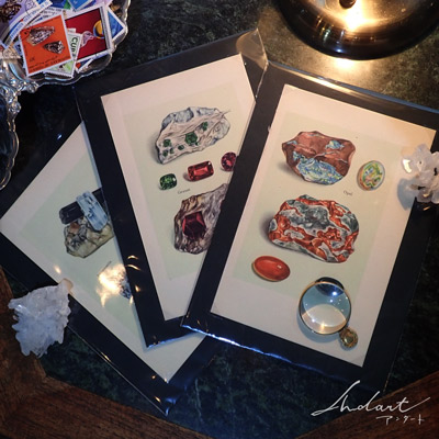 学術書の間で眠っていたビンテージの図版たちを お部屋に飾れるように1枚1枚簡易額装しております。 リトグラフの技法で刷られた鉱物たちは しっとりと上品な佇まいです。 本物の鉱石を眺めるのも素敵ですが、 かつて鉱物の専門家が見つめた鉱物画たちの 繊細な線と色のうつろいを楽しむのも良いものです。 単行本程度の大きさなので、 小さなスペースでも飾ることができるのが魅力。 1枚で飾るのも...