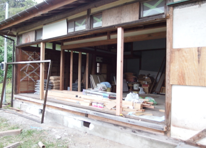 JUGEMテーマ:民家再生 JUGEMテーマ:ギャラリー 7月のギャラリーのオープンを境に、古民家リノベーションをずっとお休みしていましたが、9月後半から稲刈りが終わった友人たちが来てリノベーション工事再開。 まずは壊れたサッシを取り外し、柱を挿入。 4枚あったサッシのうち台風で割れなかったサッシ2枚を残し、両サイドは壁に。 雨戸は修理して再利用し、戸袋を新たに作る。 縁側の側面はガラス窓で、やはり昨年の台風で窓枠ごとずれてしまい、ず...