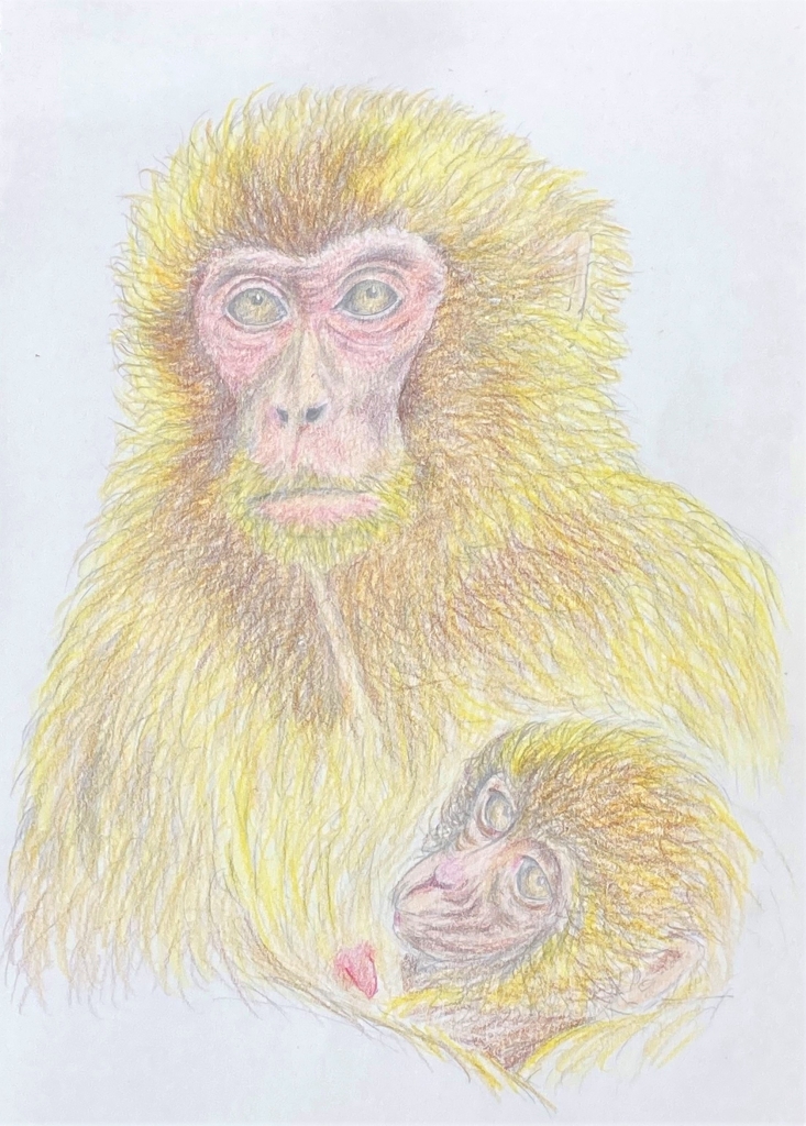 JUGEMテーマ:ギャラリー ふとインスピレーションが湧いて、「黄金の毛をしたさる」を描こうと思った。 黄金の毛をしたさるは、本当はアマゾンの奥地にしかいない希少な種。 でももし私がよく知っているポピュラーなおさるさんが、黄金の毛をしていたら どんな姿だろう、と想像して描いてみた。 もし本当にいたら、かなり有り難そう(金運をもらたしそう)で、 つい拝んでしまいそう(笑)。 そんでさらに思ったが、「スーパーサイヤ人やん、これ!」ってこと。...