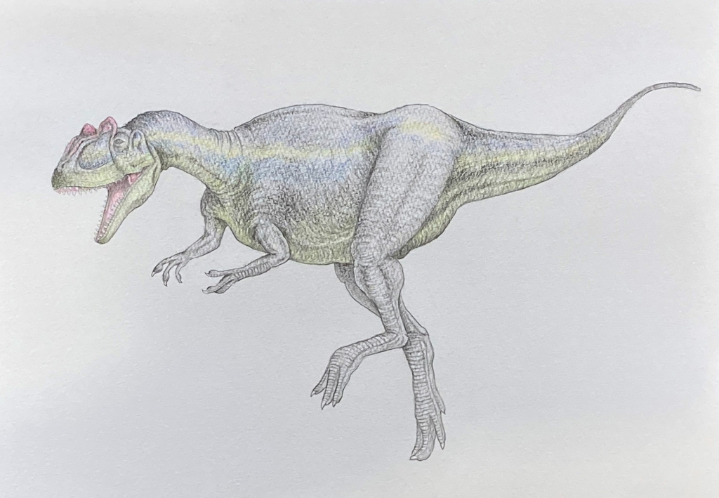 JUGEMテーマ:ギャラリー 前回のディアブロケラトプスに続いて、恐竜を描いてみよう!の第2弾。 私と息子は、なぜか昔からアロサウルスが好きです。 肉食恐竜の中で一番有名なのはティラノサウルスですが、なぜかあれよりも アロサウルス派(笑)。深い理由はありませんけども。 地面を力強く蹴って、疾走しているところと思われますが、 こんなに躍動的だと背景の画像がないのが淋しいですね。 だって息子の図鑑には、背景が載ってなかったんですもの・・・。