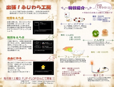 JUGEMテーマ:アートワークショップ こんばんわ 旅から帰った工房長です. 岡山まで新幹線は使わずに こつこつ電車を乗り継いで 行ってまいりました. 山陽本線となると車両も古くて 景色も平和で のどかな車窓でよかったです. さておき 12月の出張工房まで1週間となりました. ということは 次回の出張工房の時にお配りする 次次回のチラシを作らねばということです. 1月も出張工房やります. でも第一土曜日は2日ということで 第二週の土曜日になります. ゲスト講師はビーズ工房 わたなべさ...