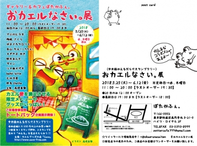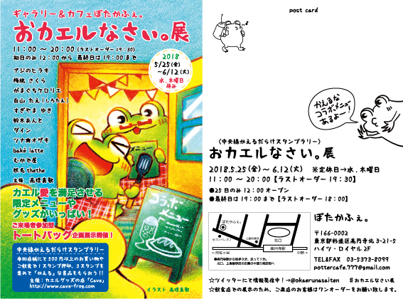 高理真歌主催「おカエルなさい。展」 (中央線かえるだらけスタンプラリー中カエルイベント) 5/25(金)〜6/12(火)水木定休 (DMは曜日が逆になっていますが金曜始まり火曜終わりになります) 11:00〜20:00 (L.O 19:30) 25日12:00オープン 19日19:00展示終了(コラボメニューは18:00L.O.) 参加作家 ●アジのヒラキ ●梅桃さくら ●がまぐちケロリエ ●白山たえ(しろたえ) ●すぎやまゆき ●鈴木あんと ●ダイン ●ツナ☆オザキ ●bakè...
