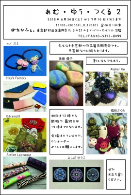 「あむ・ゆう・つくる 2」 2018年6月30日(土)〜7月10日(火) 11:00-20:00 (L.O.19:30) 定休日:水木 展示初日6/30(土) 12:00〜 最終日7/10(火) 19:00まで 名もなき手芸部の作品展示販売会です。 手芸部なのに絵もあります。 [店長より] 名もなき、とはいえプロ顔負けのクオリティ! いつもぽたかふぇ。に集まって 手芸について精進されている様子が伺えます。 細部まで作り込まれた一品をぜひご覧ください。 ...