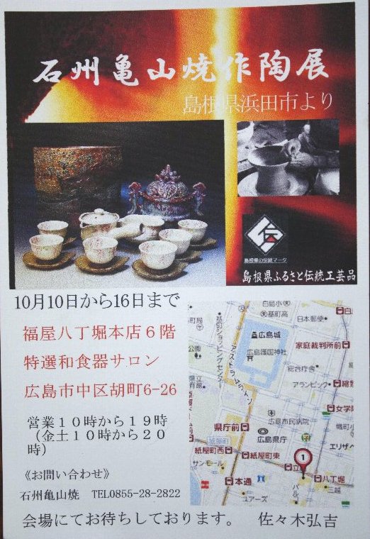 JUGEMテーマ:展覧会の告知をしよう! ◎石州亀山焼作陶展(個展)【会場】広島 福屋 八丁堀本店6階特選和食器サロン営業10時から19時(金土10時から20時)広島市中区胡町6-26会期 10月10日から16日会期中は出張販売します。ぜひお立ち寄りくださいね!