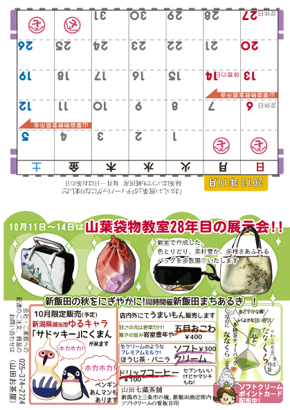 10月のカレンダーを作成、本日より店内にて配布中です〜。10月といえば!!当店では毎年恒例となりました、山葉袋物教室の展示会の月です。教室も今年でもう28年目、県内北から南まで、様々なところから通ってこられる生徒さん達の手によってつくられた色とりどりのかばん達のお披露目です!期日は 10月11日(金) 12日(土) 13日(日) 14日(祝)朝9:00〜夕方6:00となっております。このときしか出会えないかばん、全国散り散りへと渡っていくかばん達もたくさん展示されています。この機会を逃さぬよう、どうぞご来場ください。一...