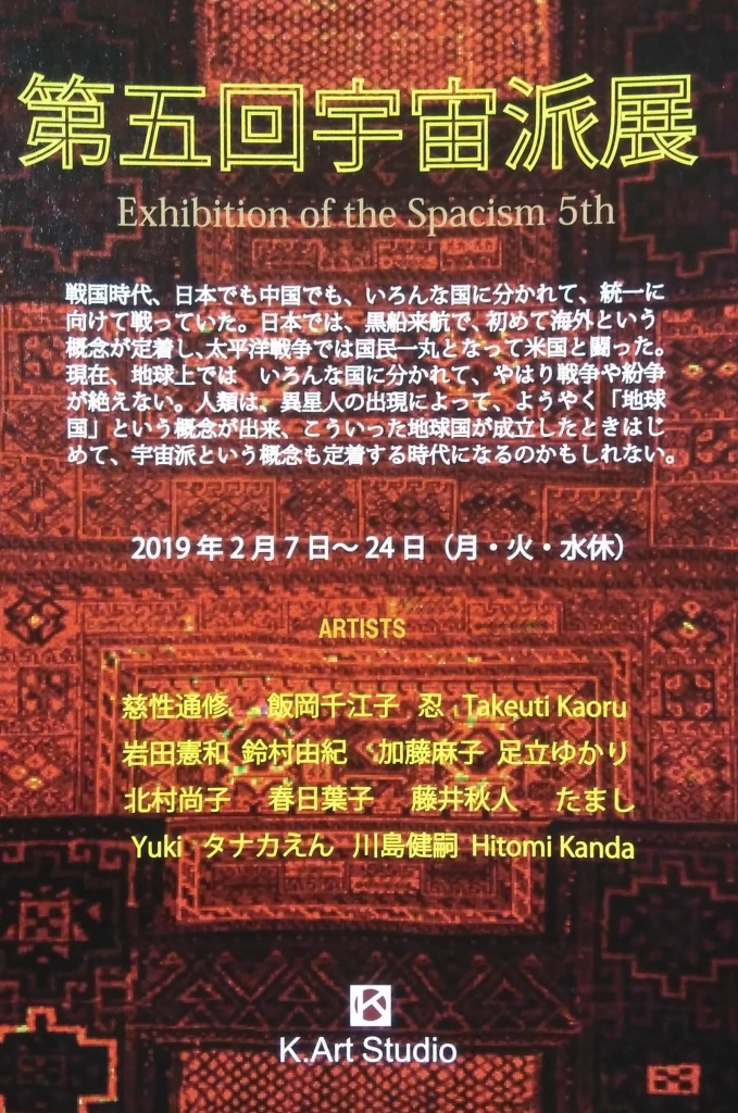 只今、名古屋市南区のK.ArtStudioさんにて開催中の『第5回 宇宙派展』に 参加させていただいています。 お知らせ遅くてすみません。。。 面白い作品展だと思います。 お時間ございましたら、どうかよろしくお願いいたします。 JUGEMテーマ:展覧会の告知をしよう!