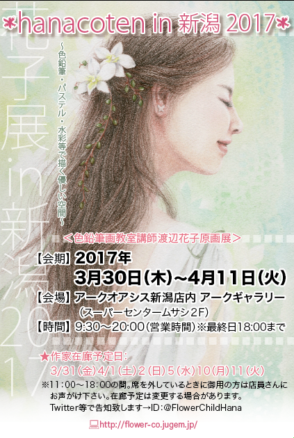 【アークオアシスギャラリー展】 ★hanacoten in 新潟2017★ ●会期:3月30日(木)〜4月11日(火) ●会場:アークオアシス新潟店内ARC GALLARY 〜色鉛筆画教室・パステル講座の作品原画展〜 hanaco在廊日(予定): 3月31日(金)4月1日(土)2日(日)、5日(水)、10日(月)11日(火) 在廊日以外も入場無料で公開しています(^o^)/ グッズ購入も従業員さんにお声がけいただければ可能です(^-^) 是非お近くにお立ち寄りの際には覗いてみて下さいませ(*^o^*) ...