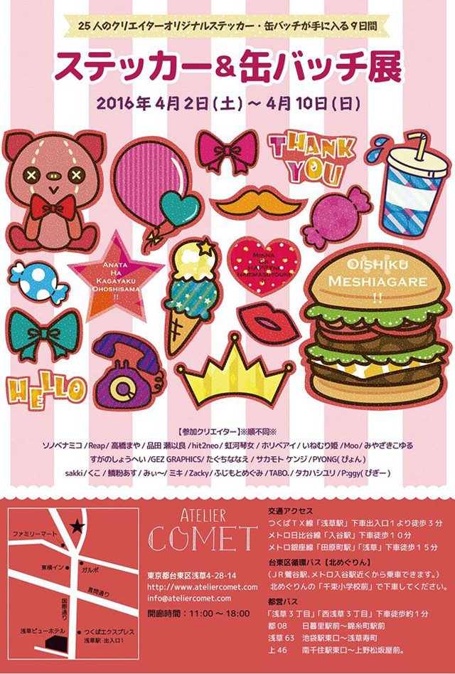 ギリギリの告知ですみません>< 4/2(土)より10(日)まで東京浅草「アトリエ コメット」さんで開催の「ステッカー&缶バッチ展」に出展いたします! アトリエ コメット / 東京都台東区浅草4-28-14 / 03-3872-7925 僕は会場にはおりませんが、新作ステッカー5種と缶バッチ4種を出展します! 早速ご紹介します^^ 「ウール100%」ステッカー 「朧(オオカミ)」ステッカー 「旭(ライオン)」ステッカー 「プニピヨ」ステッカー 「ぴこーん」ステッカー 「見据える(オオカミ)」缶バッチ 「おしくらひ...
