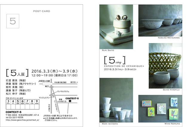 JUGEMテーマ:展覧会の告知をしよう! 貸スペース 「5人展」 3月3日(木)〜9日(水) 12:00〜19:00(最終日17:00) 石渡磨美(陶芸) 齋藤瑠璃(陶アクセサリー) 能村美穂(絵) 廣藤聖子(陶器と竹) 松川伸子(陶器)