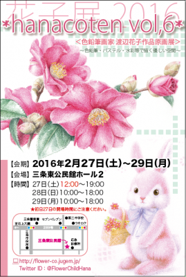 「hanacoten vol,6」 三条東公民館での第6回花子展の案内状DMが出来ました(^▽^ ) 今回は一ヶ月切ってしまったので、ひとまず自宅プリントで。 この週末より、お世話になっている各所にDM設置のお願いに回っております。 設置店舗はツイッターで順次報告していますので、 Twitter ID@FlowerChildHana を、ぜひチェックしてみてくださいませ(^o^)/ 今のところ2月は毎日つぶやき継続中〜! JUGEMテーマ:展覧会の告知をしよう!