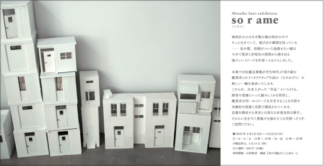 2つの展覧会を同時開催!! ◉ギャラリー奥スペース Shizuho Sato exhibition[so r ame] 入場料300円 https://chibihobako.wordpress.com/ 鳩時計の小さな木製の鳩は時計の中でそっと生きていて、いまかいまかと飛び出す瞬間を待っている──幼少期、母親がついた他愛もない嘘はやがて現実と非現実の狭間から湧き出る瑞々しいイメージを作家へともたらしました。 本展では作家佐藤志都穂が学生時代より取り組む鑑賞者とのインタラクティブな試み〈みそかびと〉の新しい一齣を発表いたします。これらは、出来上...
