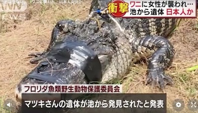 JUGEMテーマ:アメリカに関するニュース ワニに襲われ、引きずり込まれた可能性がある。日本人とみられる女性の遺体が池の中から見つかった。フロリダ州南部のマイアミに近い自然公園で水中を悠然と泳ぐ巨大なワニ。この公園での目撃を最後に行方不明となっていた日本人とみられる女性が遺体で発見された。近くに住むマツキ・シズカさん(47)。(略)夫からは、この辺りの池は危ないので近付くなと注意を受けていたということだ。(略) https://headlines.yahoo.co.jp/videonews/ann?a= 20180611-00000059-ann-int &...
