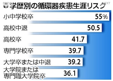 JUGEMテーマ:アメリカに関するニュース 米国の約1万4000人を20年以上追跡した大規模調査を、ミネソタ大学の久保田康彦・客員研究員(公衆衛生学)が分析したところ、収入よりも学歴が健康格差を生む可能性が浮かんだ。分析結果は、米国の医学専門誌電子版で発表された。45〜64歳の男女1万3948人を学歴や収入でグループ分けし、45〜85歳までに心筋梗塞、心不全、脳卒中といった循環器疾患を発症するリスクを算出した。学歴別にみると、最終学歴が高いほど循環器疾患の発症リスクは下がり、大学院卒が最も低...