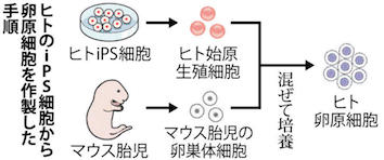 JUGEMテーマ:科学 ヒトのiPS細胞(人工多能性幹細胞)から、卵子のもとになる「卵原細胞」を作ることに、京都大大学院医学研究科の斎藤通紀教授(発生生物学)らのグループが世界で初めて成功したと発表した。(略)グループはこれまで、ヒトiPS細胞から、精子・卵子のもとになる「始原生殖細胞」に非常によく似た細胞の作製に成功していたが、その後の分化は再現できず、生殖系の細胞だと確認できていなかった。今回の実験では、(略)卵原細胞になると発現する遺伝子が77日目で活性化し、卵原細胞特有の形態が認めら...
