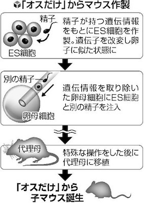 JUGEMテーマ:科学 2匹のオスの精子が持つ遺伝情報をもとに子マウスを初めて誕生させたと、中国科学院などの研究チームが11日に発表した。精子をもとに作ったES細胞(胚性幹細胞)を改変して卵子に似せ、別の精子と合わせるなどして受精卵のような状態にしたという。すぐに人間に応用することは難しいが、生命倫理面で議論を呼びそうだ。論文が米科学誌「セル・ステムセル」に掲載される。(略) https://headlines.yahoo.co.jp/hl?a= 20181012-00050000-yom-sci ・・・・・・・・・・...