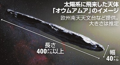 JUGEMテーマ:科学 米ハワイ大が今年10月に見つけた天体が、太陽系の外から飛来したものだと分かった。観測されたのは初めて。(略)米航空宇宙局(NASA)の研究者は「歴史的な発見で太陽系形成を研究する新たな扉を開いた」としている。 https://headlines.yahoo.co.jp/hl?a= 20171121-00000095-asahi-int どこから来てどこに行くのか ・・・・・・・・・・・・・・・ この様な宇宙関係の記事でしばしば用いられる表現に「宇宙の起源を解明する鍵となる」とかがあり...