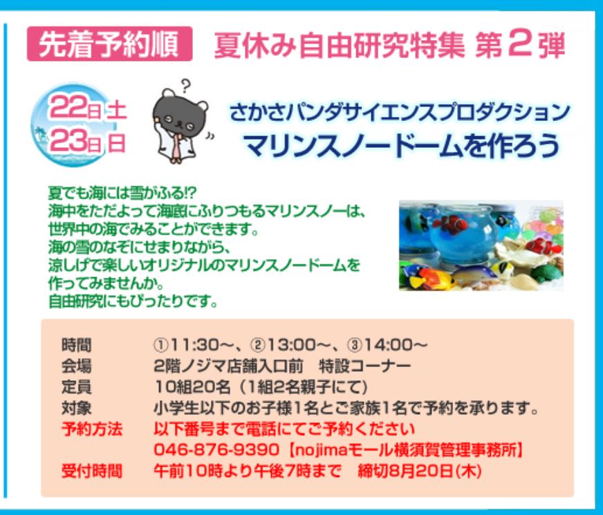 JUGEMテーマ:科学 〜海の近くの素敵なショッピングモール会場です日記〜ノジマモール横須賀夏休み自由研究特集「マリンスノードームを作ろう」8/22・23先着予約受付中です。まさかの参加費無料!?普通のスノードーム制作教室は、材料費が結構高いのですよね〜着ぐるみさかさパンダでやろうかと思ったけど、真夏に2日間は熱中症が怖いので、講師は「中の人」の方です。